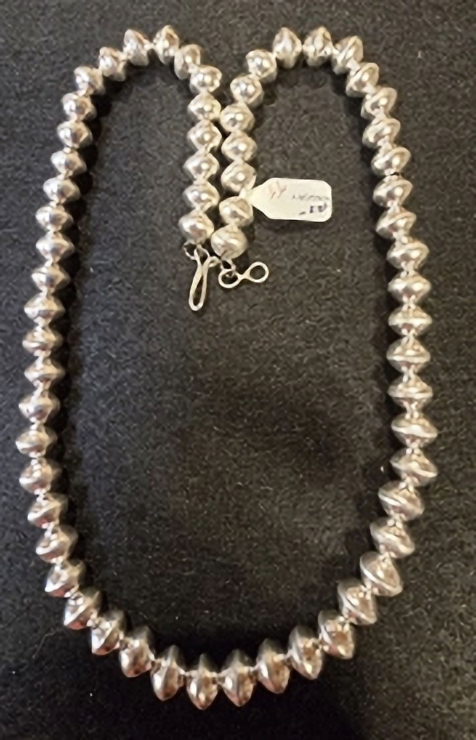 Virginia Tso is a renowned Navajo jeweler from Pinedale, AZ who has specialized in handmade sterling silver beads since the 1970s. For Virginia, bead-making is a family tradition for many generations. Virginia makes beads in the traditional way which involves melting down scrap silver, rolling it into sheets, cutting out the rough shapes, doming each bead, stamping or shaping, punching the hole, soldering each half together, filing and buffing to a shiny finish or oxidizing to a soft satin patina. One of the few Navajo silversmiths who still makes her sterling silver beads completely by hand.